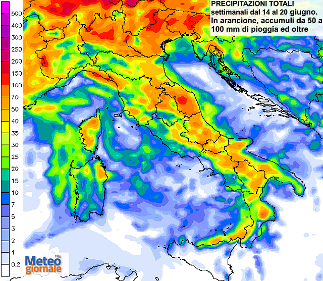 La mappa sottostante evidenzia i totali di precipitazione attesi nell’arco della settimana entrante fino al prossimo sabato 20 giugno compreso: appare evidente l’intrusione perturbata anche al Centro-Sud, che non si limiterà a semplici episodi d’instabilità. Le precipitazioni, poche o molte, si vedranno un po’ ovunque e solo la Sicilia centro-meridionale potrebbe essere saltata. Si tratterà quindi di un sostanziale passo indietro dell’estate.