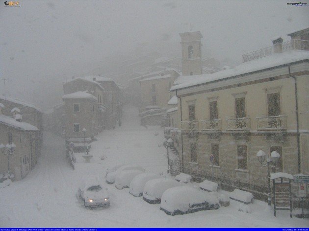 Forti nevicate stanno investendo le regioni che si affacciano sul medio Adriatico. Vere e proprie bufere si stanno abbattendo nelle zone interne dell’Ascolano, del Teramano e dell’Aquilano. Nevica copiosamente a bassissima quota, ad esempio la stessa Teramo è sotto una fitta nevicata con temperatura appena al di sopra dello zero. Si consiglia massima prudenza alla guida, chi dovesse utilizzare l’auto dovrà necessariamente essere munito di gomme termiche o catene a bordo. L’immagine che vi mostriamo si riferisce al Comune di Villalago (AQ), ad oltre 900 metri d’altitudine. Lasciamo a Voi i commenti. Fonte webcam Naturalmente Scanno.