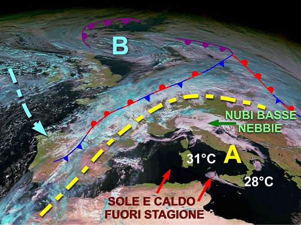 Possiamo citare il caso di 6 anni fa, quando proprio in questi giorni l’anticiclone africano abbracciava in pieno la nostra Penisola: aria molto calda sub-tropicale investì soprattutto il Sud, con temperature che raggiunsero picchi di 30 gradi ed oltre sulle due Isole Maggiori. Nell’immagine in basso possiamo vedere una foto satellitare del 17 novembre 2009.