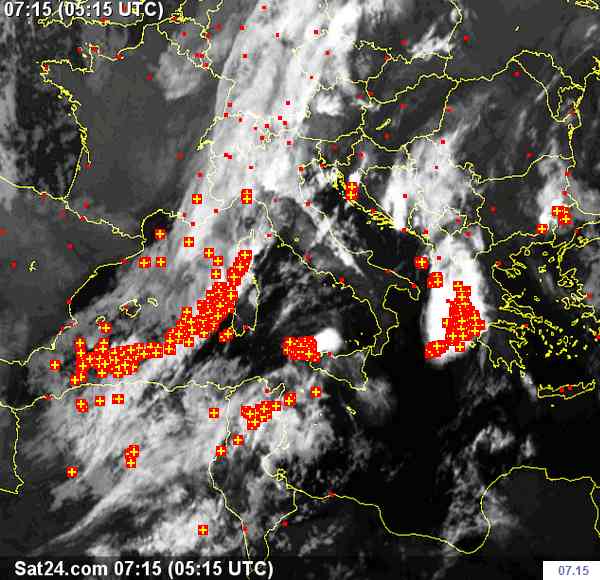 Si osservi l’immagine satellitare. Li vedete? Beh, non vederli sarebbe impossibili vista l’estensione del fronte temporalesco. E’ una striscia lunga centinaia di chilometri, che dal nord Africa e dalle Baleari si estende alla Sardegna e alla Corsica del sud.