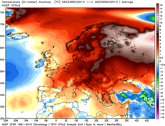 Eloquente la mappa in basso (fonte weatherbell), riferita agli scarti termici dalla norma nel periodo fra il 23 ed il 29 dicembre: solo in Irlanda e qualche zona dell’Europa Mediterranea si notano temperature nella norma o leggermente sottomedia. Situazioni di vero freddo sono relegate al Medio Oriente. L’ondata di caldo invernale continua ad affliggere in modo eccezionale gran parte della Russia, investendo anche le terre artiche europee, che fino ad ora erano rimaste più ai margini dall’invasione dei flussi d’aria calda.