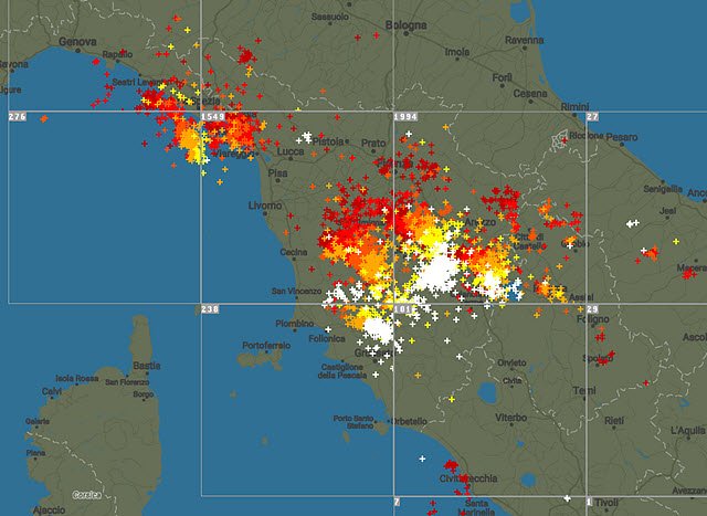 L’aria fredda che avanza verso l’Italia ha innescato un serie di forti temporali tra la Liguria e la Toscana. I temporali, meno diffusi che in Toscana, si sono attualmente estesi anche al Lazio, Abruzzo e Molise.