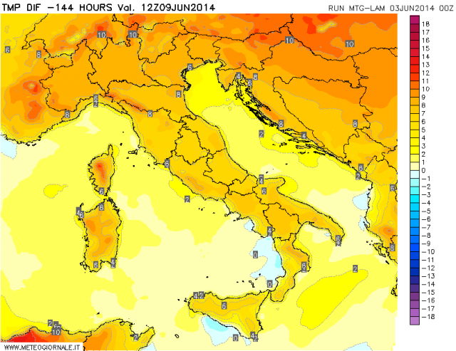 Fugato ogni dubbio circa la prima, vera sfuriata anticiclonica africana, non ci resta che soffermarci sull’entità del rialzo termico e del caldo. Lo strumento a nostra disposizione è il modello ad alta risoluzione elaborato dal nostro Centro di Calcolo, il MTG-LAM, e nello specifico andremo ad osservare le differenze termiche tra oggi e il prossimo 9 giugno. Il raffronto è sostenuto sui valori diurni, ovviamente nel momento più caldo della giornata.