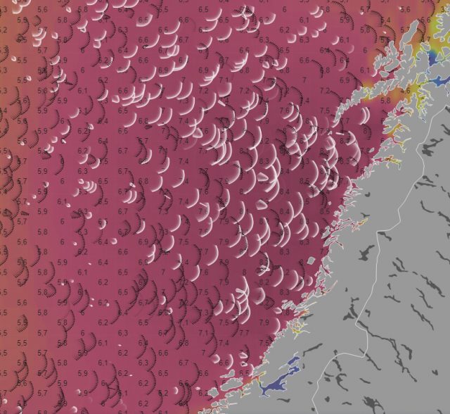 Lungo le coste norvegesi, i dati meteorologici hanno indicato delle temperature variabili fra i +2 e i +6°C, accompagnate da venti da sud-ovest che hanno raggiunto raffiche ad oltre 100 km/h (98 km/h a Floro, 87 km/h a Gullfaks, e fino a 141 km/h ad Ona Ii).