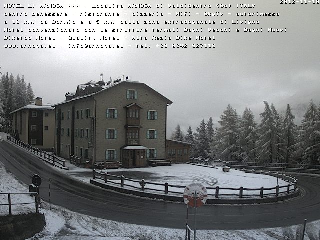 Le precipitazioni nevose stanno interessando soprattutto la zona di Valdidentro, a partire dai 1700 metri di altitudine. Fiocchi sono segnalati su Arnoga, centro di villeggiatura ubicato a 1870 metri di altitudine lungo la strada che collega le località di Bormio e Livigno. La temperatura è di poco superiori allo zero. Fonte webcam www.arnoga.eu