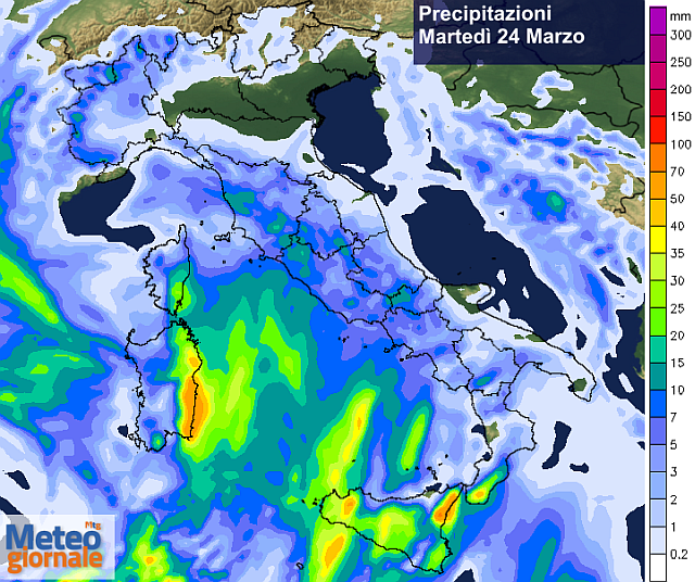 Le prime zone che sperimenteranno l’arrivo di piogge e temporali saranno le regioni di ponente: un occhio di riguardo alle due Isole Maggiori, dove sono attesi i primi fenomeni intensi già entro martedì sera, alimentati da forti correnti sciroccali. Temporali anche forti colpiranno infatti le aree orientali e meridionali di Sicilia e Sardegna.
