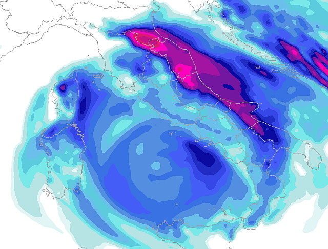 Già da diversi giorni i modelli di simulazione delle precipitazioni tracciano un quadro esplosivo: tra Romagna, Marche ed Abruzzo si potrebbero avere circa 48 ore di maltempo particolarmente cruento fino a martedì, dai connotati prettamente autunnali con l’aggiunta di possibilità di nubifragi e grandinate di grossa taglia. Le proiezioni più pessimistiche propendono per accumuli persino superiori ai 150-200 mm in appena 24 ore, che potrebbero certamente costituire un problema per locali episodi alluvionali lampo. Fonte mappa www.meteogiornale.it/mappe-modelli-meteo