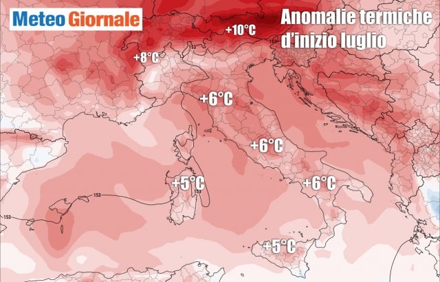 Per capire quanto saliranno ci avvaliamo della mappa della anomalie termiche attese nella giornata del 2 luglio, alle ore 13. Si tratta di anomalie, è bene rammentarlo, rispetto a una media trentennale di riferimento e nello specifico alla media 1981-2010. Appare evidente un aumento generalizzato, ma le deviazioni più consistenti le avremo probabilmente sull’arco alpino. Qui si scorgono punte di 10°C in più, mentre più in generale possiamo dire che gli aumenti si attesteranno mediamente tra 4 e 6-7°C.