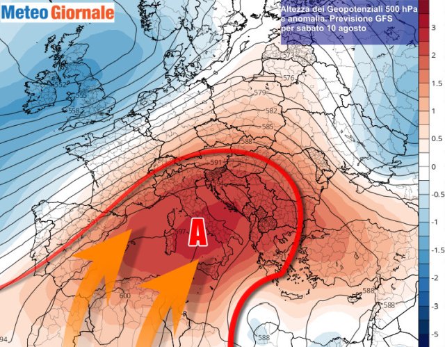 L’approfondimento di una saccatura atlantica verso la Spagna sarà la causa della più marcata rimonta anticiclonica sub-tropicale che investirà tutto il Mediterraneo Centrale. L’Italia sarà direttamente colpita da questa avvezione rovente.