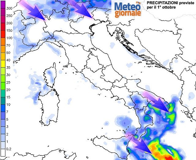 La cartina sotto illustra una tendenza delle precipitazioni domenica: strascichi d’instabilità si manifesteranno all’estremo Sud in affievolimento, mentre si notano le deboli precipitazioni su Alpi e Prealpi connesse all’arrivo di una perturbazione atlantica. Qualche fenomeno si potrà avere anche in Liguria, Alta Toscana e Sardegna. Questa prima perturbazione faticherà a sfondare sull’Italia, ma potrebbe preparare il terreno per successivi e più energici assalti perturbati nord-atlantici.