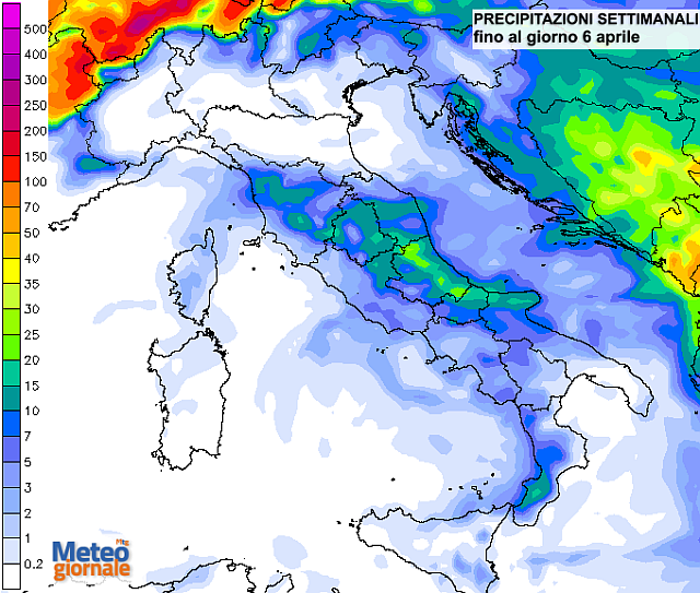 La mappa in basso mostra le precipitazioni settimanali, da ricondurre proprio al peggioramento del fine settimana. Non è possibile ancora entrare nel dettaglio, ma è presumibile che proprio fra Pasqua e Pasquetta transiti il fronte perturbato più significativo al Centro-Sud seguito da correnti fredde settentrionali.