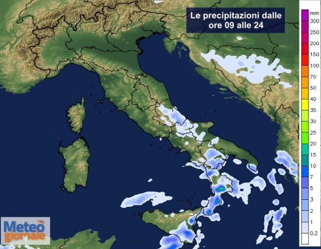 Cosa attendersi? Sicuramente un calo delle temperature per una discreta ventilazione orientale e conseguentemente un incremento dell’instabilità incentivato dagli inevitabili contrasti termici. Ecco quindi che avremo delle piogge, forse anche qualche temporale e delle spruzzate di neve attorno ai 1000-1200 metri. I fenomeni più corposi, come si evince dalla mappa (entità e distribuzione dalle ore 09 alla mezzanotte del 16 marzo) evidenzia picchi di 15-20 mm tra la Calabria e la Sicilia orientale.