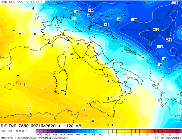 Dando uno sguardo al modello GFS-Special, focus Italia, abbiamo la conferma che la perturbazione che lambirà le Alpi sarà in grado di contenere la vigoria anticiclonica africana. Il rialzo termico ci sarà, ma non sarà così violento come preventivato. Osservando l’immagine scopriamo che su alcune regioni, tra mercoledì e giovedì, ci sarà addirittura una diminuzione termica marcata.