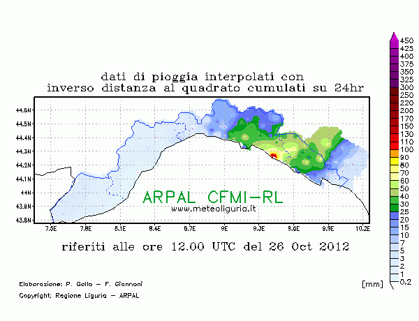 Nella mappa allegata (fonte ARPAL) si nota il punto rosso che evidenzia la zona di massima precipitazione su Sestri Levante.