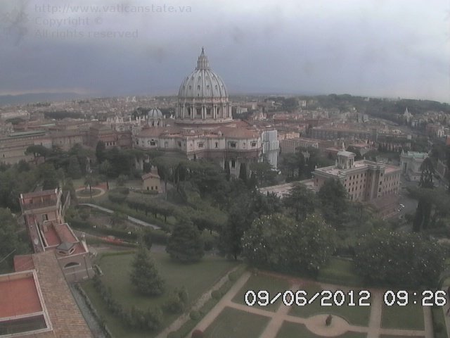 L’aria umida e instabile che risale dal nord Africa ha causato la formazione di varie celle temporalesche che raggiunto il tratto centrale del Tirreno si sono rinvigorite e hanno raggiunto le coste Laziali. Le ultime segnalazioni ci dicono che sono in atto precipitazioni temporalesche su Ponza, Latina, Vigna di Valle e sulla Capitale. Dalla webcam orientata sulla Basilicata di San Pietro il cielo appare scuro e minaccioso. Fonte www.vaticanstate.va